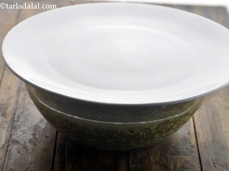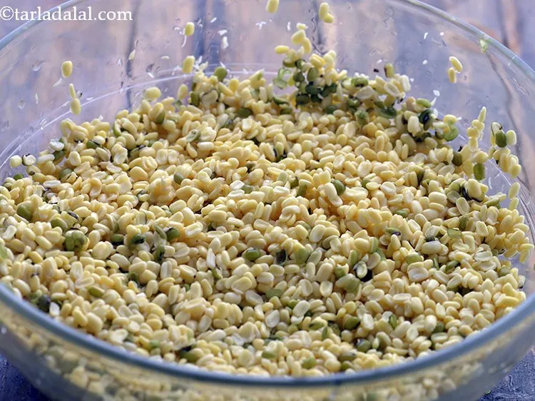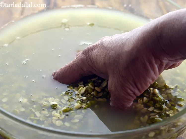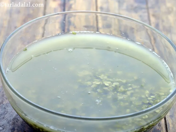 ढक्कन से ढककर मूंग दाल को ४ घंटे के लिए पर्याप्त पानी में भिगो दें।