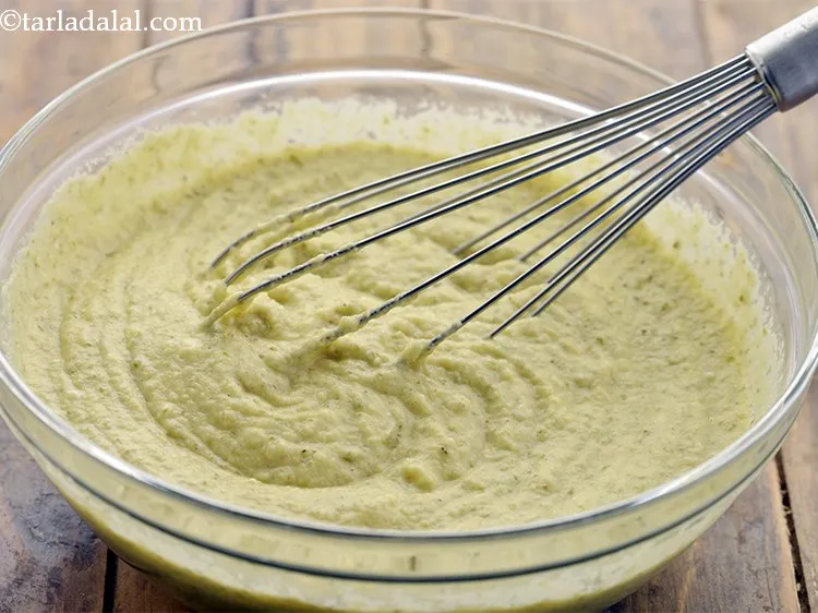 - इस मिश्रण को एक गहरे बाउल में निकाल लें, तेल, हींग, शक्कर, बेसन, दही और नमक डालकर अच्छी तरह मिला लें।