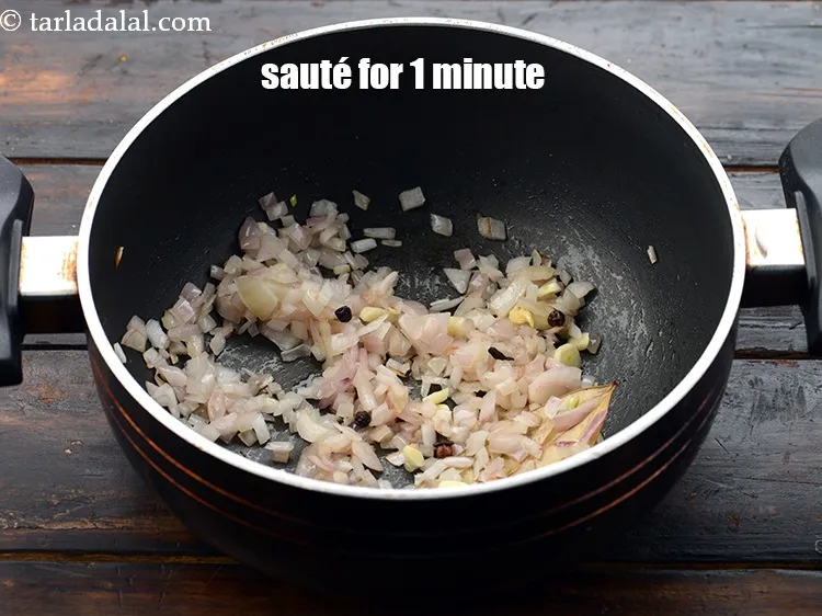 - Heat the oil in a deep non-stick pan, add the cloves, cinnamon, peppercorns, bay leaf, onions and garlic and sauté on a medium flame for 1 minute.