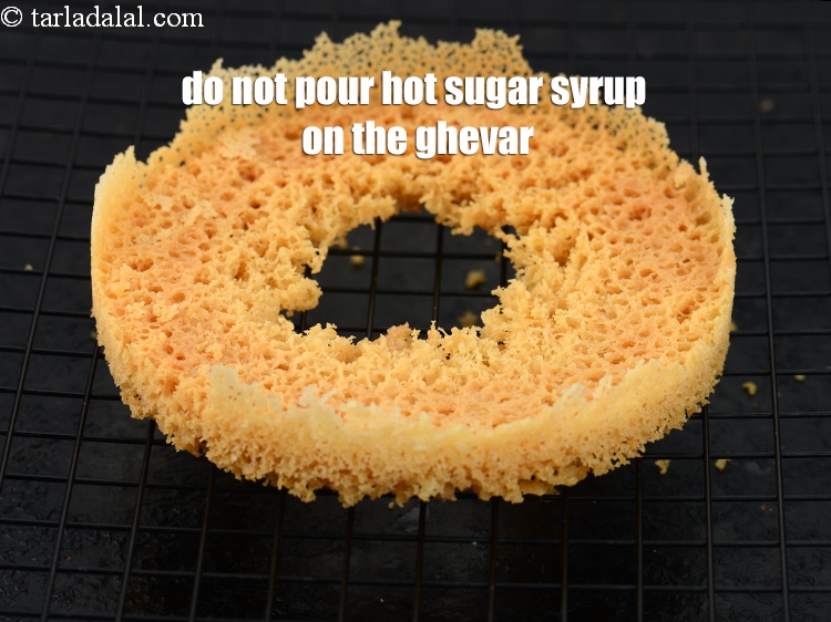 - Pour the warm sugar syrup on each ghevar, allow the sugar syrup to drain.