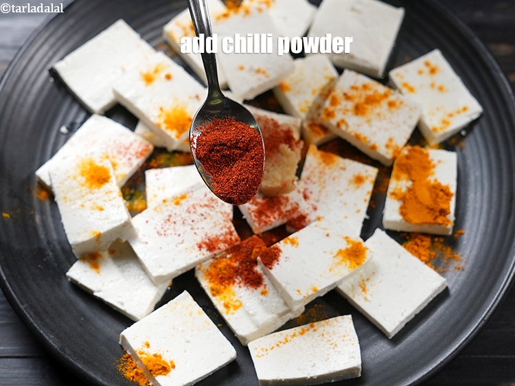- To make malvani style paneer pakoda, combine the paneer, lemon juice, ginger, garlic, turmeric, chilli powder and salt in a deep bowl and toss gently. Keep aside for 30 minutes.