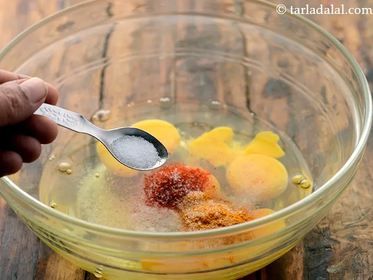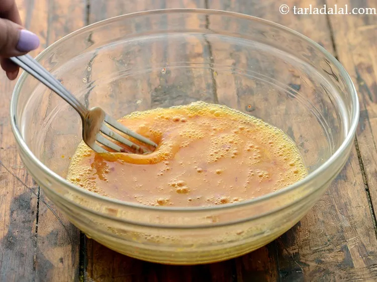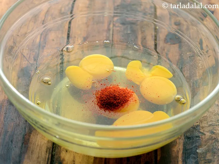 - To make masala omelette, combine the eggs, chilli powder, turmeric powder and salt in a deep bowl and whisk well using a fork.