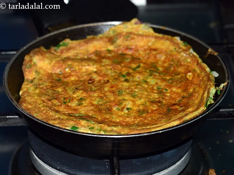 - Heat 1 tsp of oil in a broad non-stick pan, pour half the egg mixture and tilt the pan slightly, cook on a medium flame for 2 minutes.