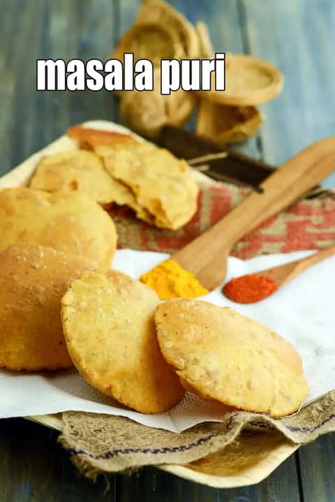 masala puri is a popular Indian deep fried bread. Made from a dough of whole wheat flour, chilli powder, haldi and hing, masala poori is easy and quick to make.