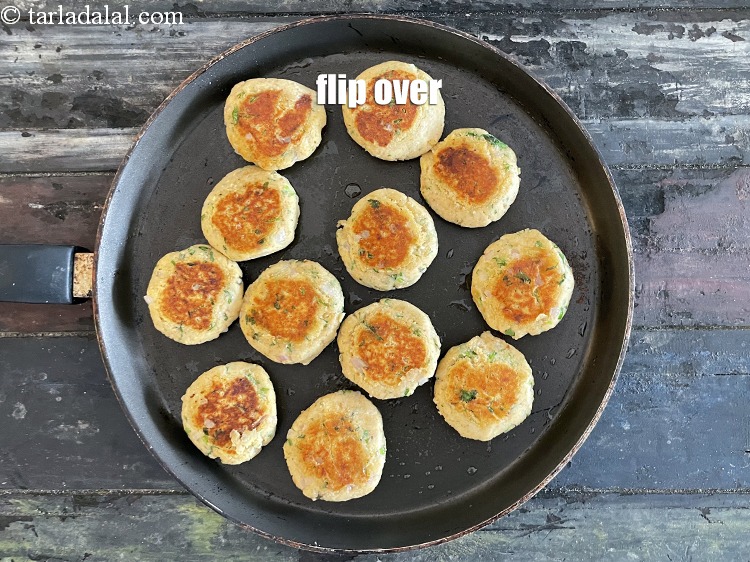 - Cook each tikki on a slow flame, using 1/8 tsp of oil till they turn crisp and golden brown in colour from both the sides.