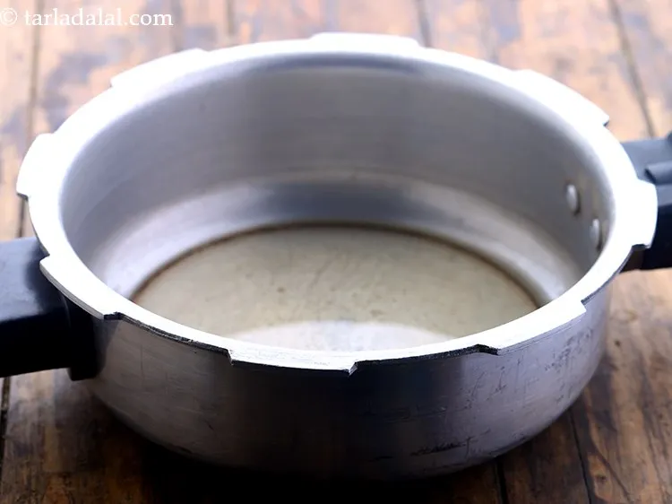 To temper pressure cooker matar pulao, heat the ghee in a pressure cooker. Alternatively, you can make use of a stovetop pan if pressure cooker is not available. Also, you can use butter or oil in place of ghee in the pulao.