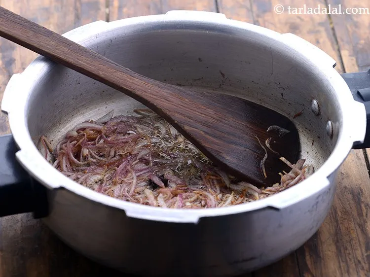 - Heat the ghee in a pressure cooker, add the cloves, cinnamon, cardamom, star anise and onions and sauté on a medium flame for 8 minutes.