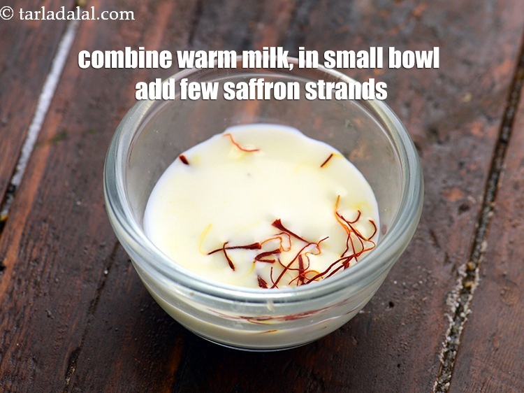 - To make kesar mawa modak, combine warm milk and saffron in a small bowl, mix well and keep aside.