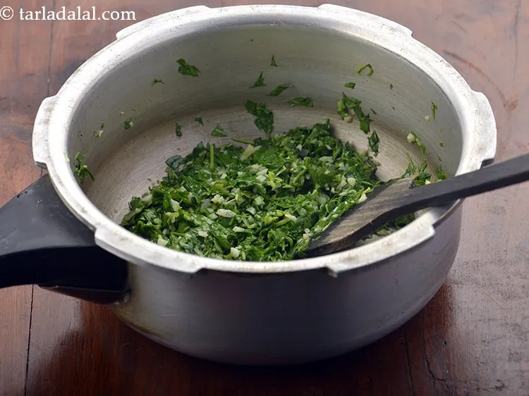 - Add the methi and sauté on a medium flame for 30 seconds.