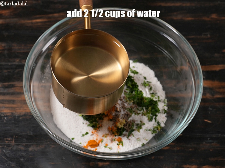 - मेथी घावन बनाने के लिए, एक गहरी कटोरी में सभी सामग्रियाँ के साथ 2 कप पानी डालें । घोल पोरींग कनसिसटंसी (pouring consistency) का होना चाहिए।