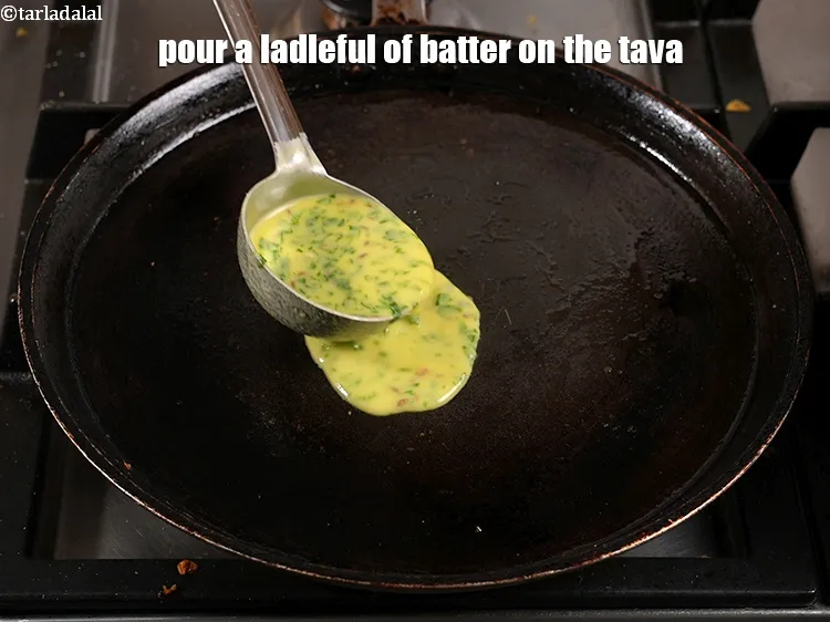 - तवे पर एक कडछुल घोल का डालें और समान रूप से फैलकर 150 मि. मी. (6 inch) व्यास का गोल बनाएं।