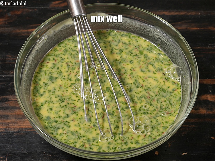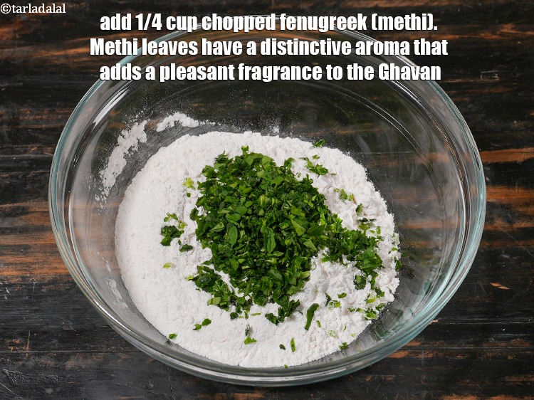 1/4 कप कटी हुई मेथी डालें। मेथी के पत्तों की एक विशिष्ट सुगंध होती है जो घावन में एक सुखद खुशबू जोड़ती है।