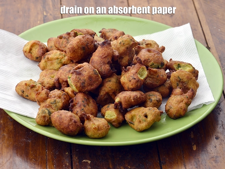 - Drop spoonfuls of the mixture into hot oil in a deep non-stick pan and deep-fry a few at a time on a medium flame, till they turn golden brown in colour from all the sides. Drain on an absorbent paper.