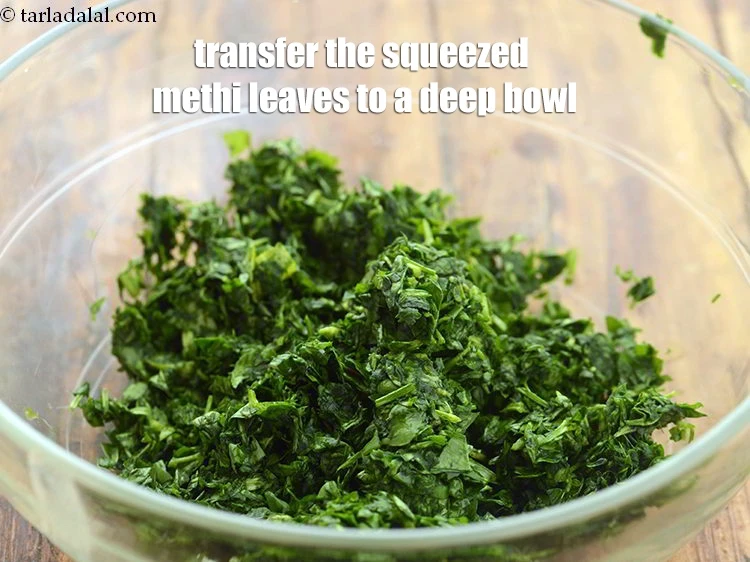 Transfer the squeezed 1/2 cup finely chopped fenugreek leaves (methi) to a deep bowl.