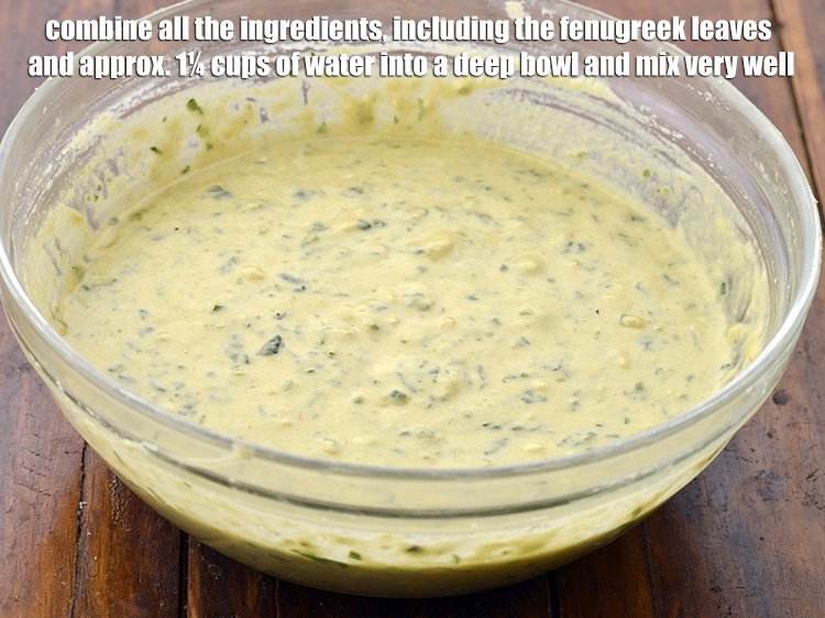 - Combine all the ingredients, including the fenugreek leaves and approx. 1¼ cups of water into a deep bowl and mix very well.