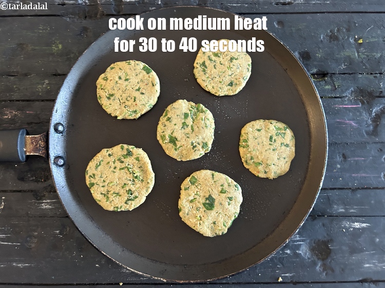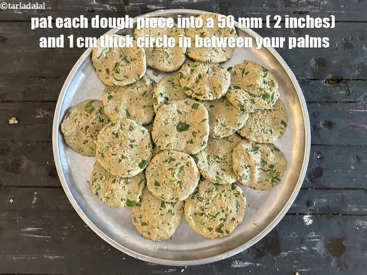 Divide the dough into 20 equal portions. Pat a portion of the dough into a 50 mm. (2”) diameter and 1 cm thick circle in between your palms. Place 6 dough rounds on a hot tava (griddle). Cook these on a medium flame using ½ tsp of oil, till they turn golden brown in colour from both the sides. Serve methi na dhebra hot with green chutney and low fat curds.