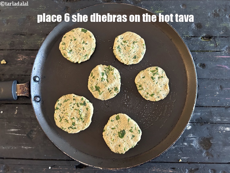 Place 6 dhebras on the hot tava (griddle) at a time.
