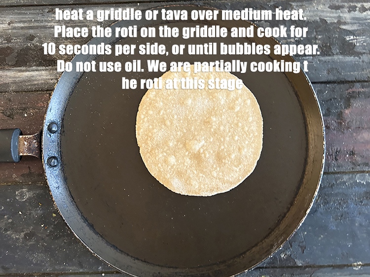 Heat a griddle or tava over medium heat. Place the roti on the griddle and cook for 10 seconds per side, or until bubbles appear. Do not use oil. We are partially cooking the roti at this stage.