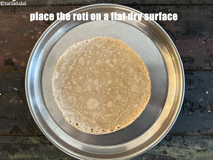 - Place a roti on a flat dry surface, place one portion of the stuffing in the centre and spread it evenly.