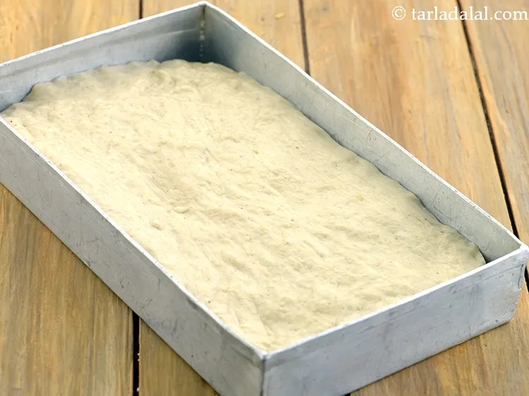 - Knead the dough again and put the dough into a greased rectangle aluminium tin of 250 mm. (10”) x 150 mm. (6”) and press well.
