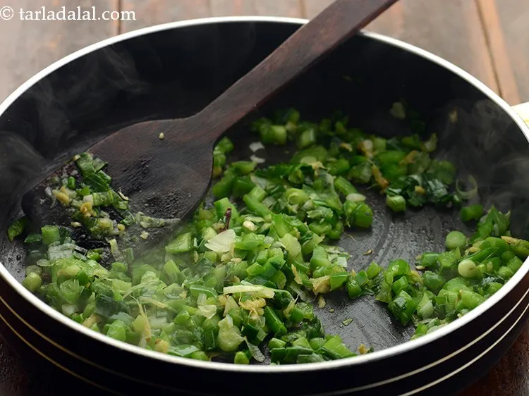 - Add the green chillies, ginger, capsicum and spring onions and sauté on a medium flame for 2 to 3 minutes.