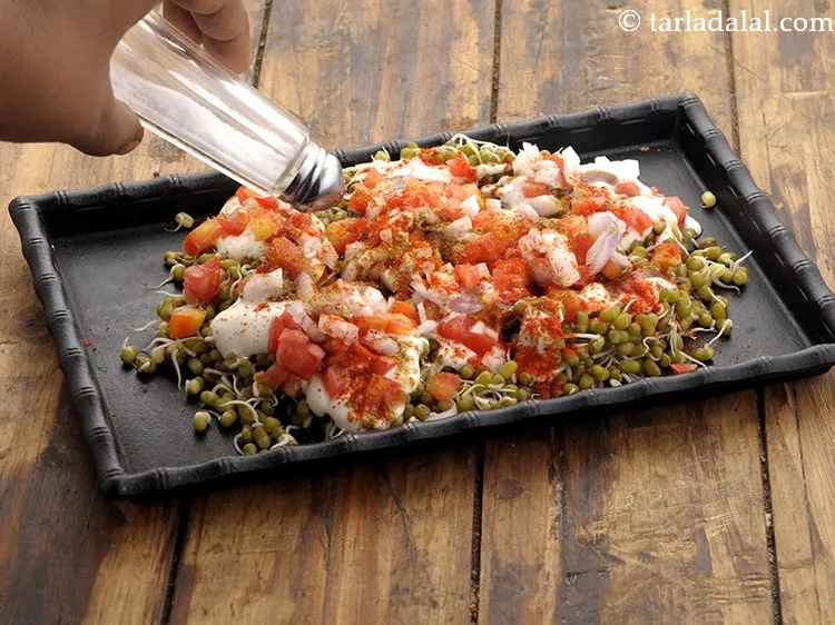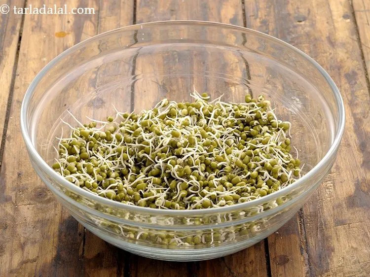 5. Put half the moong sprouts on a serving plate.