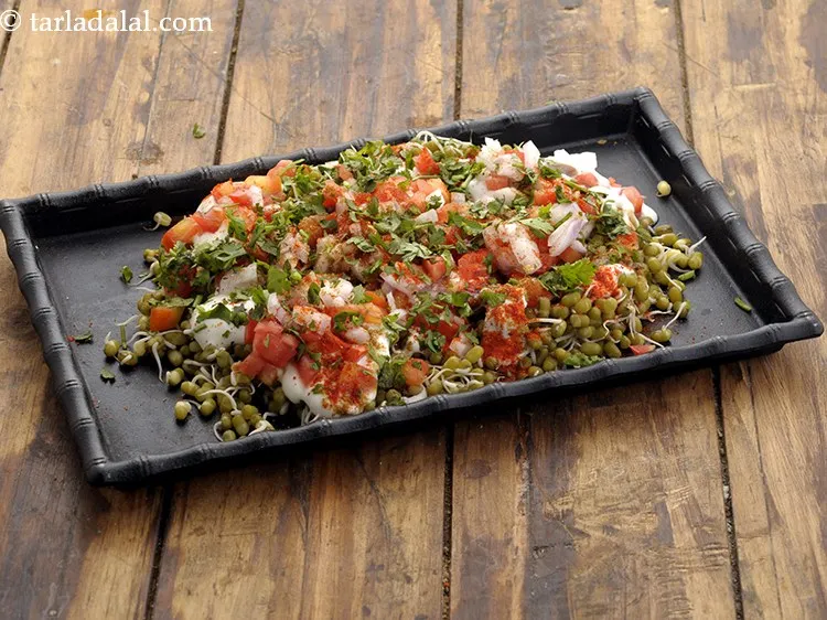 Chaats are usually known to be unhealthy as we imagine the ingredients to be fried and everything cooked using a lot of oil. But here we have a healthy variation made with sprouted moong which are super healthy known as moong dahi misal recipe | healthy moong dahi chaat |