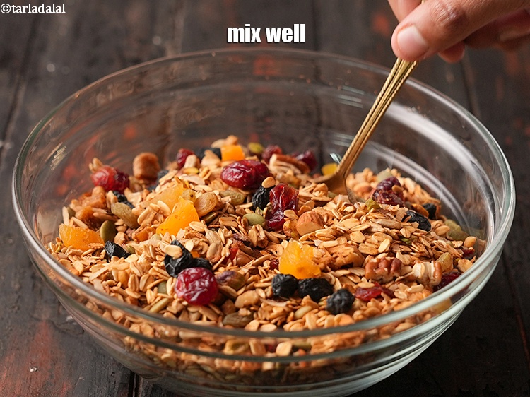 Transfer the muesli mixture to a broad non-stick pan. Cook on a medium to low flame for 12 to 15 minutes, while stirring continuously. Let the muesli cool completely. Store muesli in an airtight container.