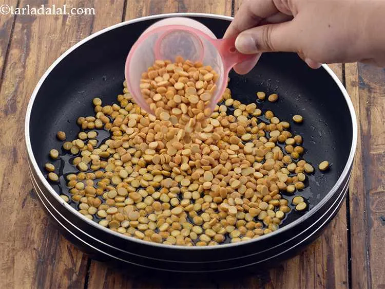 - To make mysore chutney, heat the oil in a non-stick pan, add the chana dal and urad dal and cook on a medium flame for 2 to 3 minutes or till they turn light brown in colour, while stirring continuously.