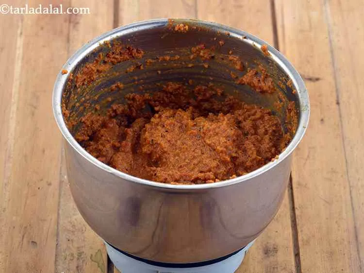 - ठंडा होने पर, मिक्सर में मिश्रण के साथ नमक और आवश्यकतानुसार पानी डालकर मुलायम होने तक पीस लें। (इस नुस्खे में 4 टेबल-स्पून चटनी की आवश्यकता है, शेष चटनी को एक एयर-टाइट कंटेनर में एक डीप-फ्रीजर में स्टोर करें)।