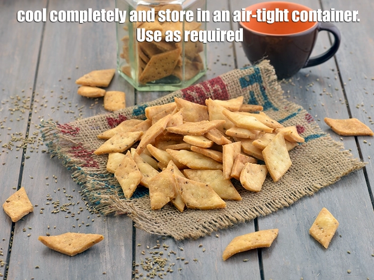 After deep-frying, it is essential to cool completely the namak para before storage. If stored warm, condensation will make them soft. Once completely cooled, the savoury jar snack can be transferred into an air-tight container and use as required. They remain fresh and crunchy for several weeks, ready to be relished instantly with a cup of hot masala chaai anytime.