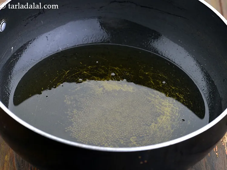 - Heat the oil in a small non-stick pan and add the mustard seeds.