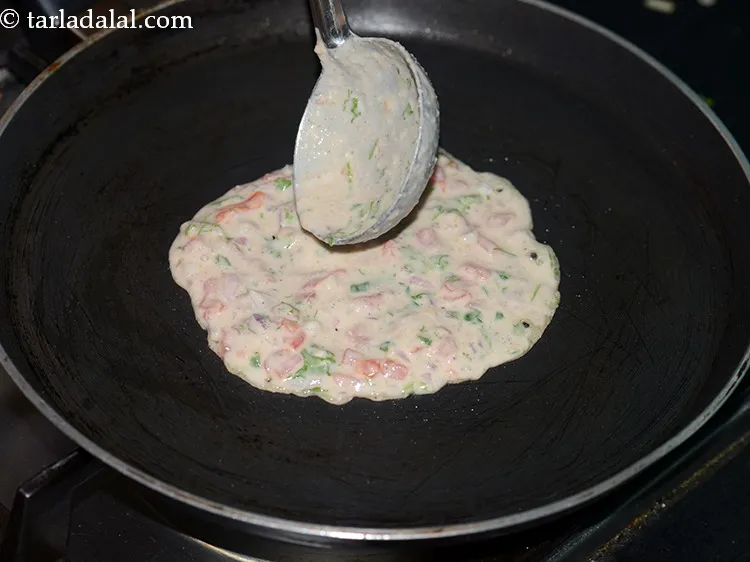 - Pour a ladleful of the batter on the non-stick tava (griddle) and spread it in a circular motion to make a 125 mm. (5”) diameter circle.