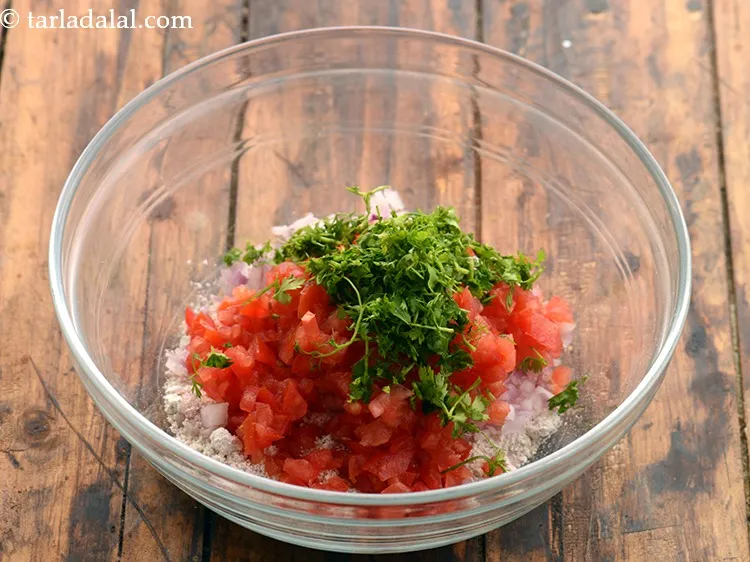 - To make nutritious jowar and tomato chilla, combine all the ingredients along with ¾ cup of water in a deep bowl and mix well to make a batter of pouring consistency.