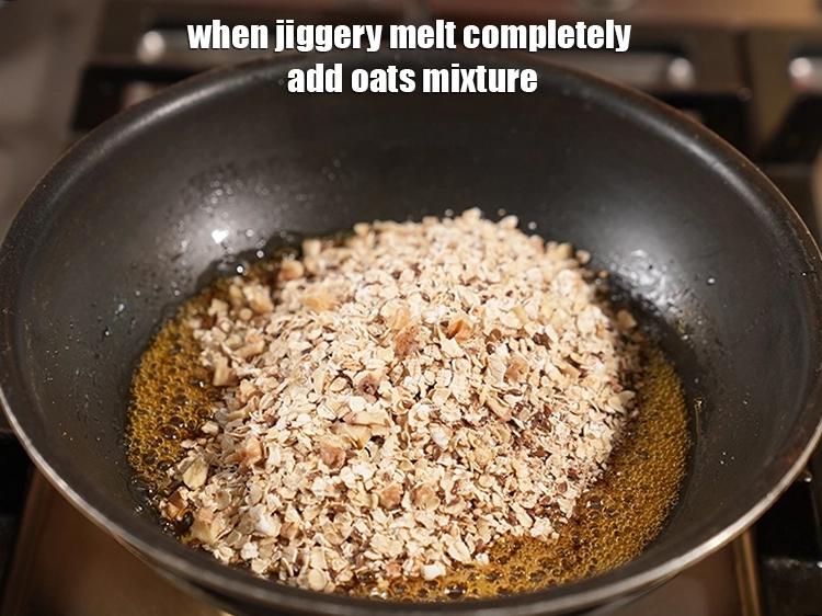 When jiggery melt completely add oats mixture on same pan, and mix it well, on low flame .