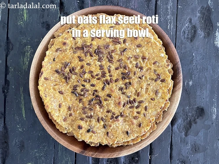 ઓટ્સ ફ્લેક્સ સીડ રોટી બનાવવા માટે, એક ઊંડા વાસણમાં બધા ઘટકો ભેગા કરો અને પૂરતા પાણીનો ઉપયોગ કરીને નરમ લોટ બાંધો. લોટના 6 સરખા ભાગ કરો. લોટ વણવા માટે થોડો આખા ઘઉંનો લોટ વાપરીને લોટના એક ભાગને 100 mm. (4") વ્યાસના ગોળ આકારમાં વણો. તેની ઉપર ½ ટીસ્પૂન અળસીના બીજ સરખી રીતે છાંટો. ફરીથી તેને 150 mm. (6") વ્યાસના ગોળ આકારમાં વણો. એક નોન-સ્ટીક તવા (griddle) ને ગરમ કરો અને રોટીને મધ્યમ આંચ પર ¼ ટીસ્પૂન તેલનો ઉપયોગ કરીને બંને બાજુથી આછા બ્રાઉન રંગની થાય ત્યાં સુધી પકાવો. આવી બીજી 5 અળસીના બીજની રોટી બનાવવા માટે સ્ટેપ 3 થી 6 નું પુનરાવર્તન કરો. ઓટ્સ ફ્લેક્સ સીડ રોટી ને તરત જ ગરમાગરમ પીરસો.