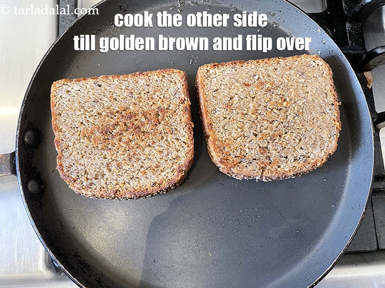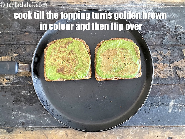- Place each open sandwich on a non-stick tava (griddle) with the prepared topping side facing downwards and cook, using ¼ tsp of oil, till the topping turns golden brown in colour.