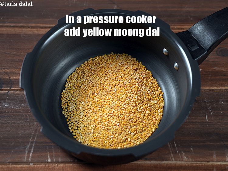एक मील का सूप बनाने के लिए, एक प्रेशर कुकर में 1/4 कप पीली मूंग दाल डालें, धोकर निथारी हुई।