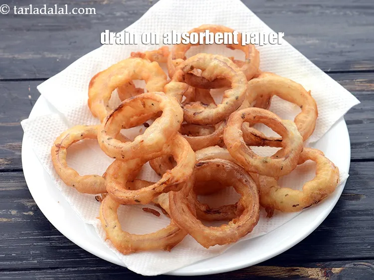 - Heat the oil in a deep non-stick pan, dip the onion rings one by one in the batter till they are evenly coated form all the sides and deep-fry in hot oil on a medium flame, till they turn golden brown in colour from all the sides. You can deep-fry 4 to 5 onion rings at a time. Drain on an absorbent
