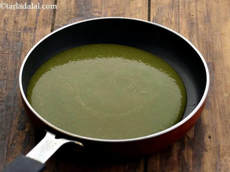 Transfer the blended mixture of Palak Moong Dal Soup for Toddlers into a broad non-stick pan.