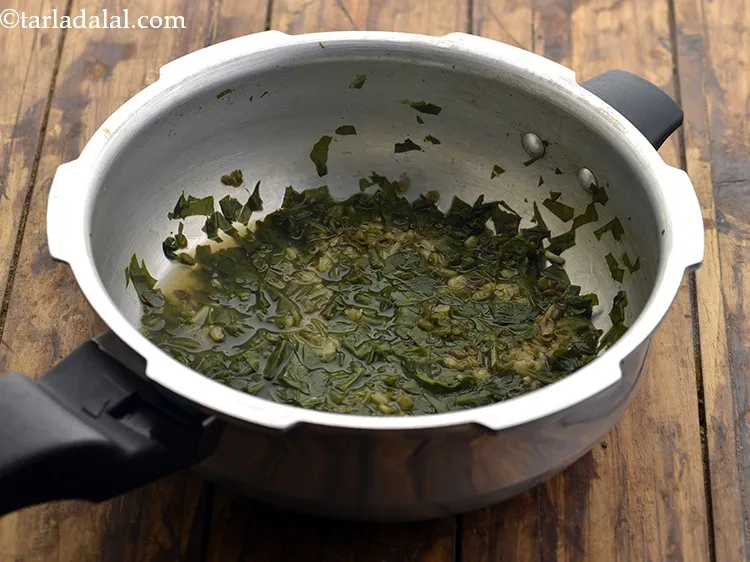 - Add the spinach, turmeric powder, chilli powder and salt, mix well and cook on a medium flame for 1 minute, while stirring occasionally.