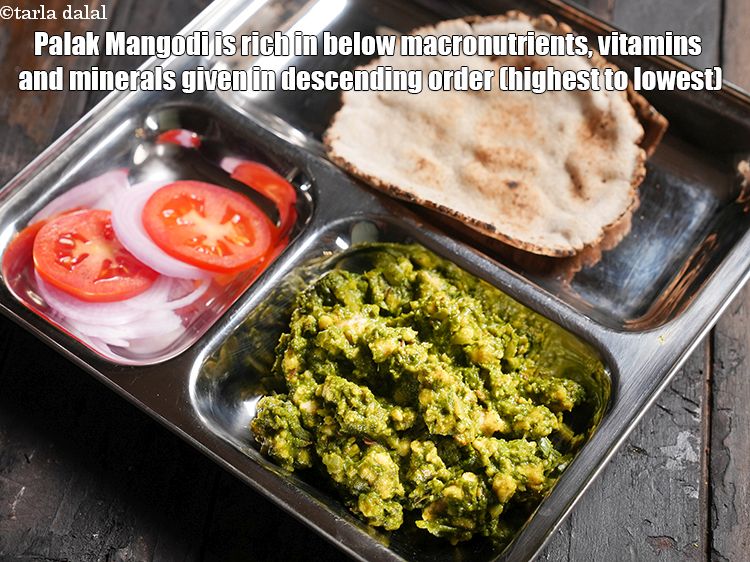 Palak Mangodi is rich in below macronutrients, vitamins and minerals given in descending order (highest to lowest).