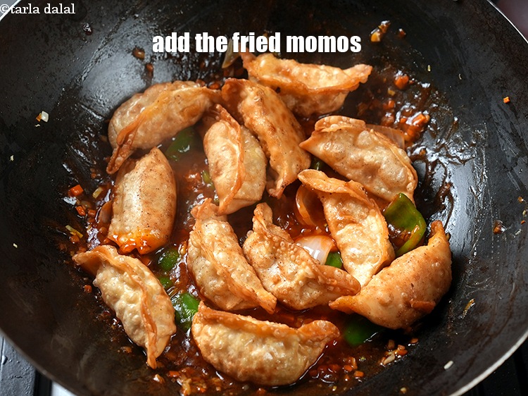 - To make pan fried momos, deep fry the momos until golden brown and crisp. Drain on an absorbent paper and keep aside.