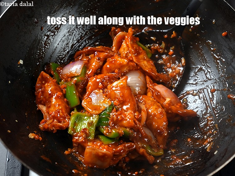 - Add salt and fried momos, toss it well along with the veggies and sauce for a minute.