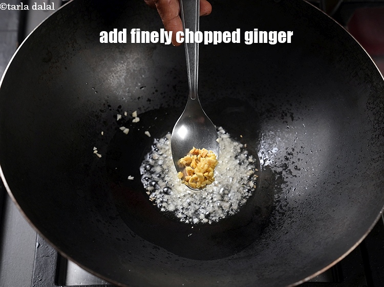 - Heat oil in a deep pan or wok, add garlic, ginger, green chillies, carrot and cabbage, sauté for few seconds.