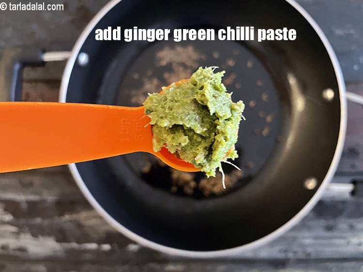 - To make panchmel ki sabzi, heat the oil in a broad non-stick pan, add the cumin seeds and ginger-green chilli paste and sauté on a medium flame for 30 seconds.