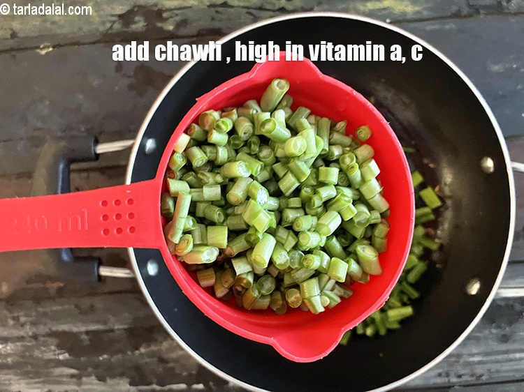 Add 3/4 cup chopped cluster beans (gavarfali). Guar has a low glycemic index, which along with high fiber count (5.4 g / cup) makes it a highly suitable choice for diabetics.