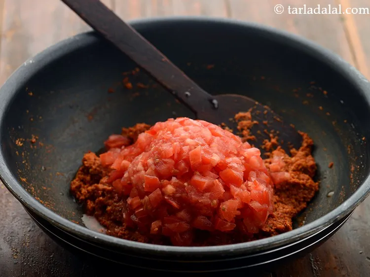 Add the chopped tomatoes. Avoid unripe tomatoes as they will affect the taste of the dish, firm tomatoes with plum red colour are slightly sweet and ideal for this recipe.