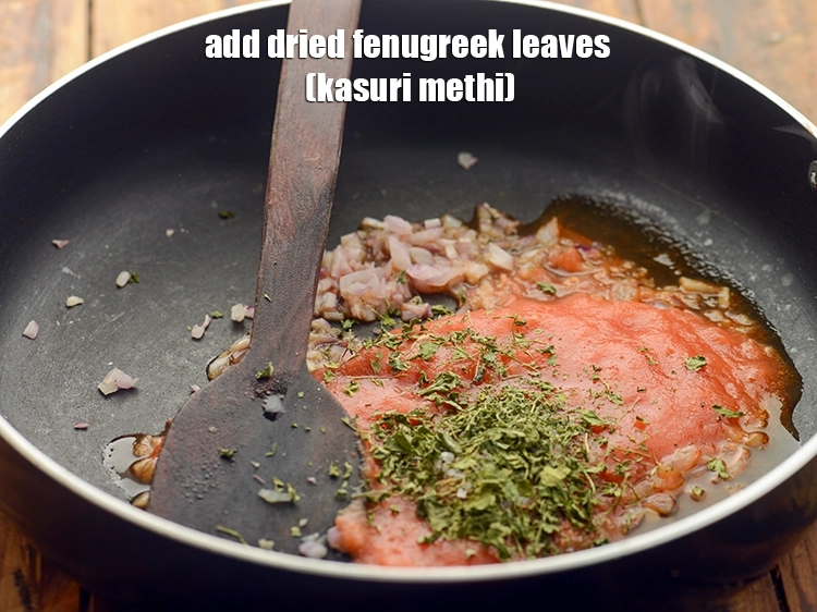 - Add the fresh tomato pulp, chilli powder, garam masala, sugar and dried fenugreek leaves, mix well and cook on a medium flame for 2 to 3 minutes.