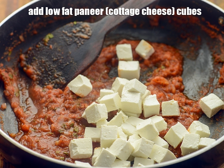 Add the 1/2 cup low fat paneer (cottage cheese) cubes. Cottage cheese can also be grated and added or you can use a combination of grated and cubed low-fat paneer.